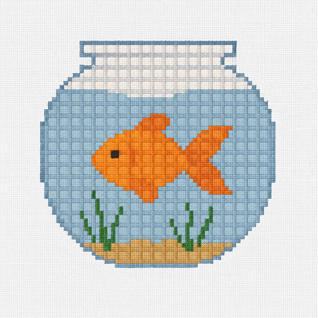 Bright, cheerful, and full of charm-Gill is a whimsical design that's sure to make any stitcher smile. 13-mesh canvas, this petite pattern features a vivid orange goldfish swimming in a classic round bowl, complete with sandy bottom and soft green reeds.