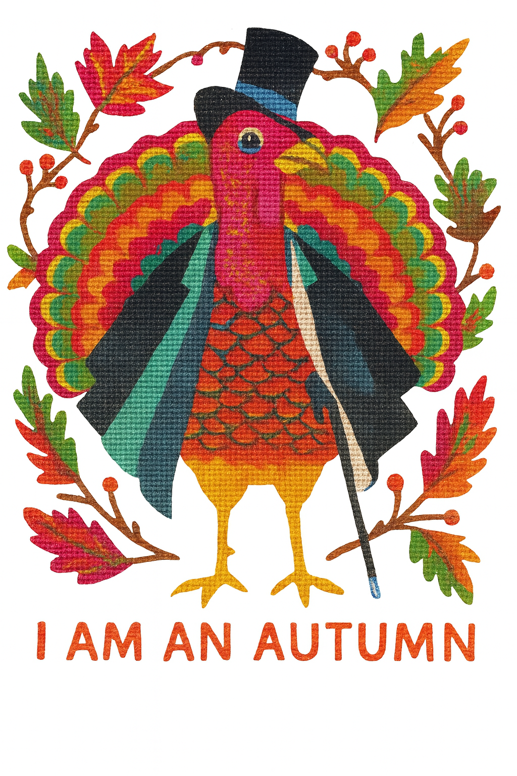 Meet RG Turkington, who is indeed "an Autumn". A whimsical 18-mesh needlepoint canvas that celebrates the charm of the season with a touch of refined humor. This distinguished turkey, dressed in his top hat and tailored cape stands proudly among a wreath of fall leaves - a true statement piece for any Thanksgiving collection.
